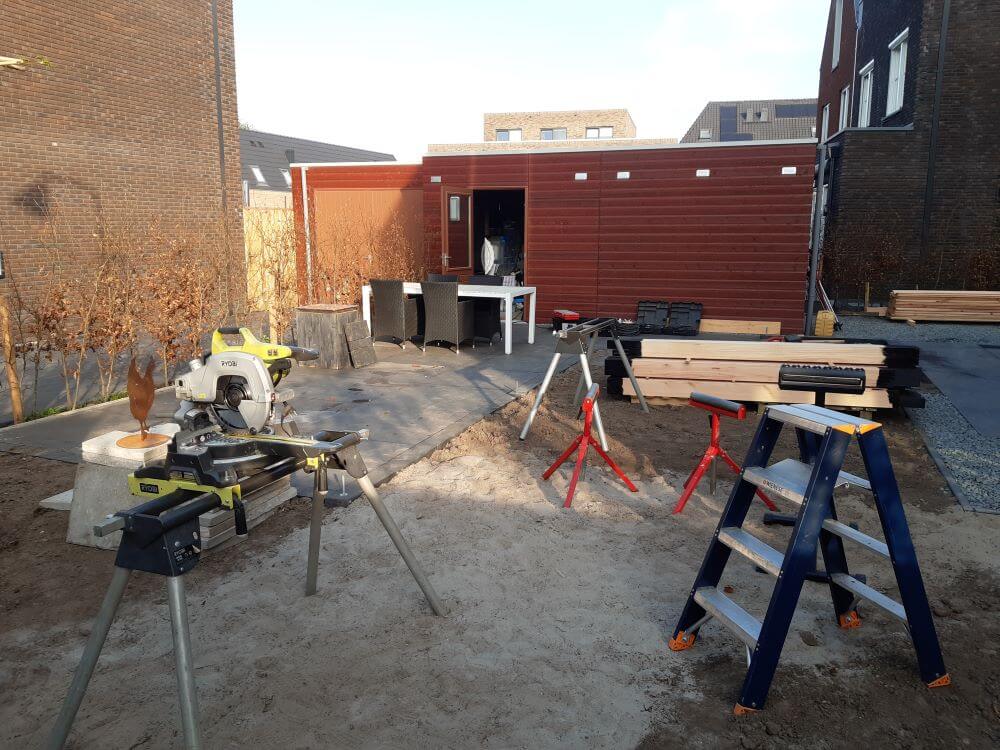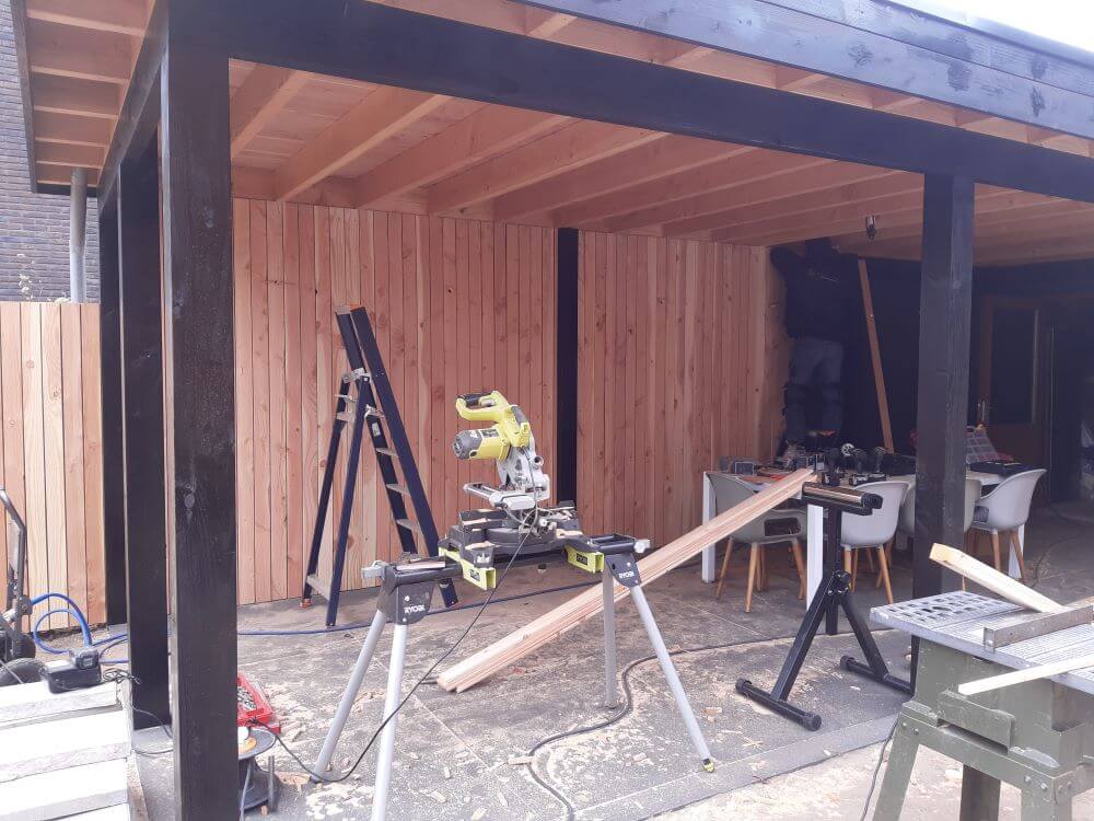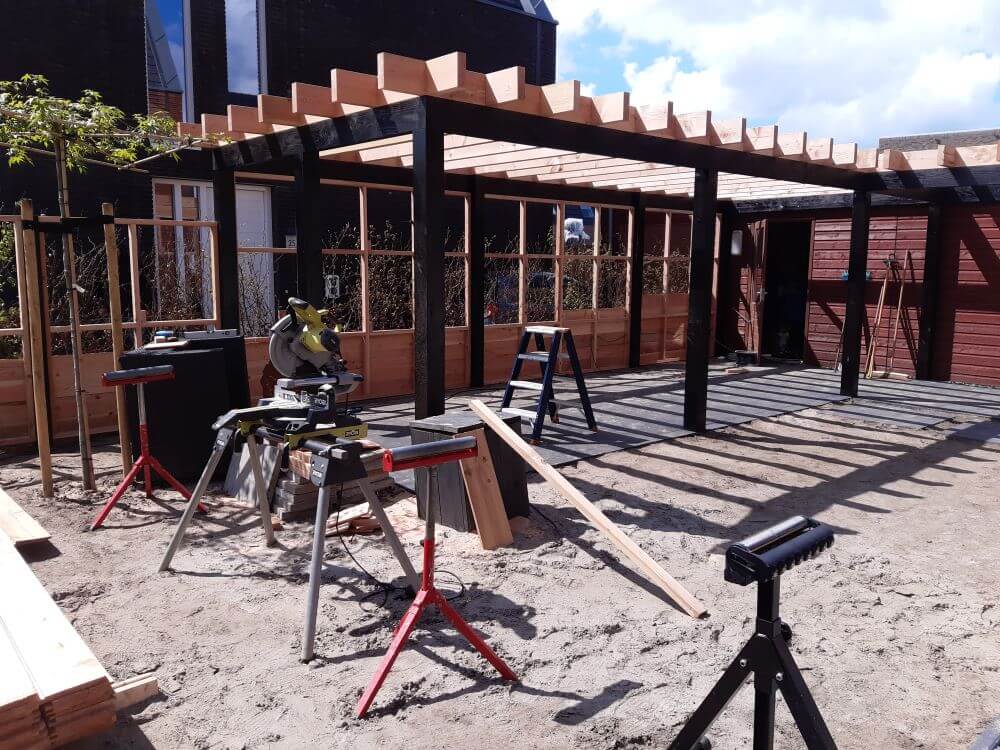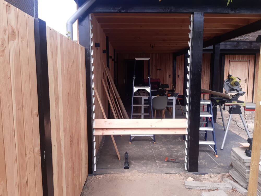 De basis van dit project is gelegd met een degelijke fundering bestaande uit betonnen poeren en opsluitbanden, waarop de volledige constructie is geplaatst. De overkapping is opgebouwd uit stevige Douglas palen van 14 x 14 cm, wat zorgt voor een solide en duurzame constructie.