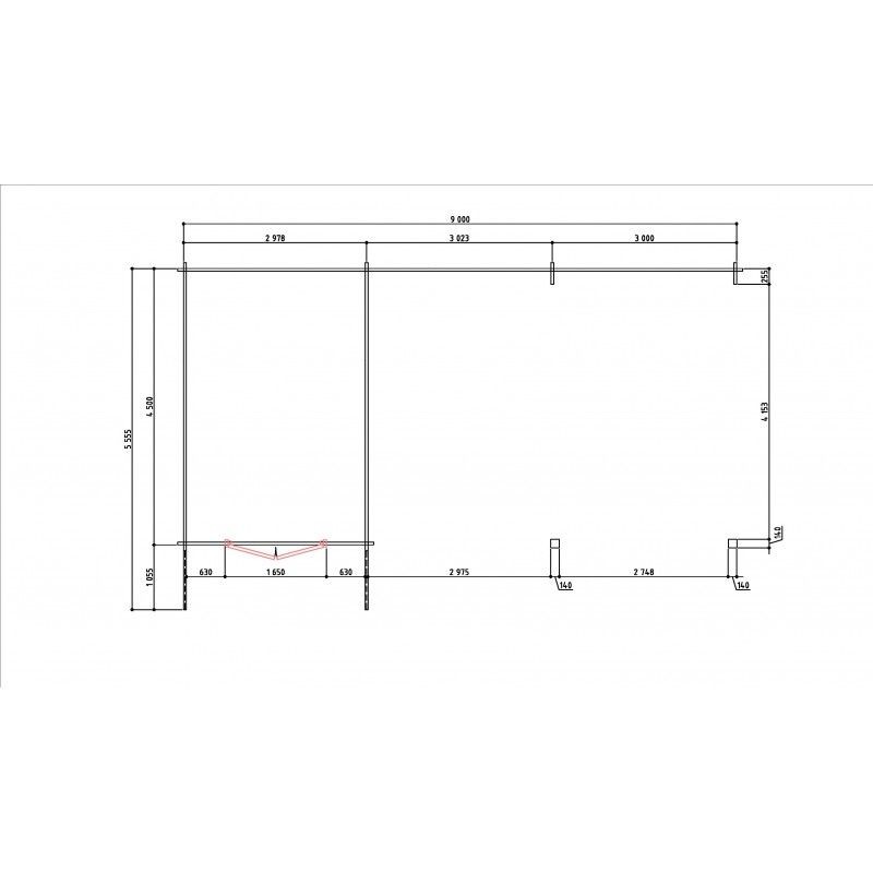 Kapschuur Benodet 900 x 450 cm Luxe kapschuur met asymetrisch zadeldak uit Inclusief: Berging 300 x 450 cm Dubbele deur Dakshingels keuze uit vier kleuren Wandbalk dikte: 33 mm Steunpaal van 14 x 14 cm Noord-Europees vurenhout